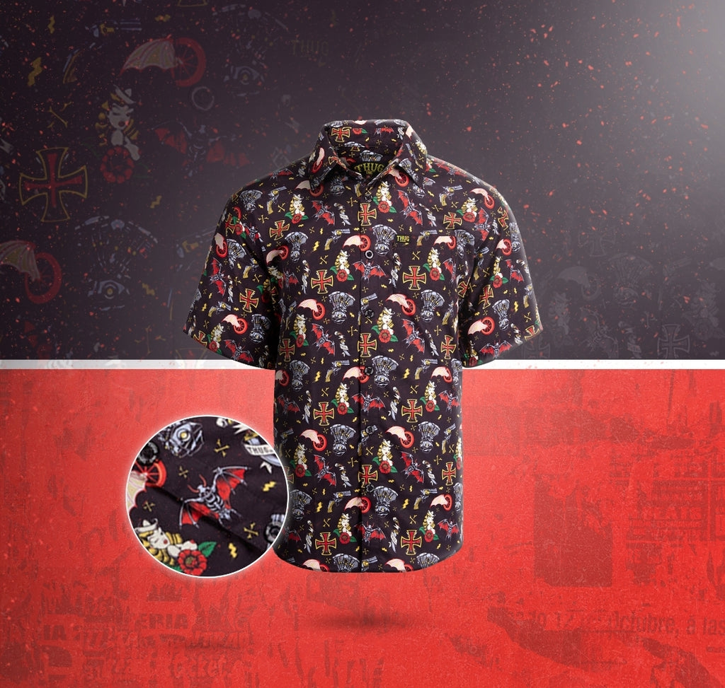 Come out guns blazing with this party shirt featuring pistols and traditional tattoo style artwork. A great color contrast of red and gold on top of a black shirt. You will be the life of the party with this one!